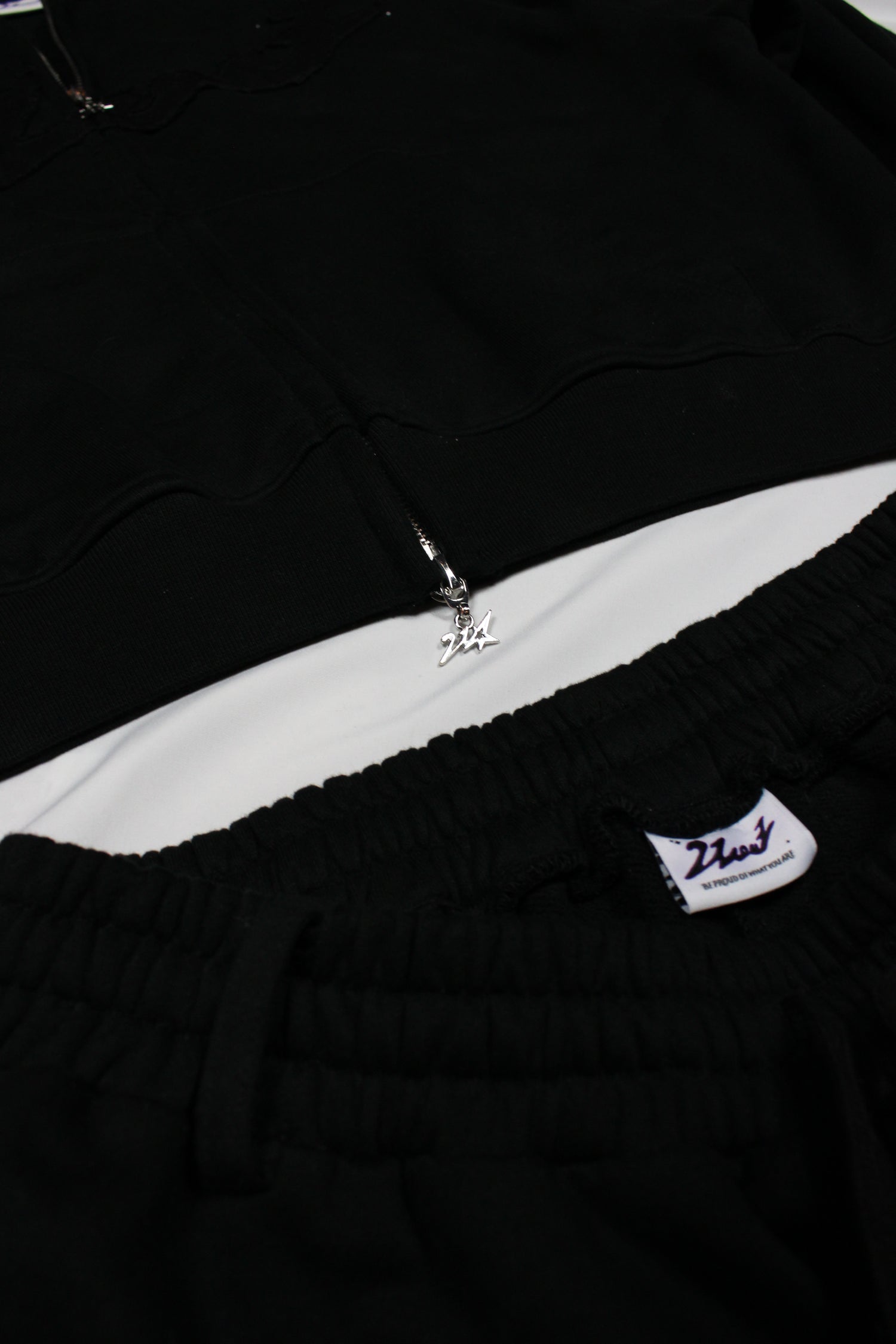 L'ensemble a été pensée pour refléter cet état d’esprit : un design sobre et noir, marqué par des détails subtils qui font toute la différence. Le sweat à capuche, réactif à la lumière, capte les reflets et attire le regard, comme un rappel que même dans l’ombre, une présence forte ne passe jamais inaperçue.